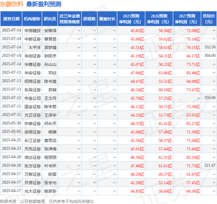 信达证券股份有限公司赵丹晨,程丽丽近期对东鹏饮料进行研究并发布了研究报告《Q2预计收入持续高增,新品表现可期》,给予东鹏饮料买入评级。 东鹏饮料(605499) 事件:公司发布2025中期业绩预告,预计实现收入106.3~108.4亿元,同比+35.01%~37.68%;预计实现归母净利润23.1~24.5亿元,同比+33.48%~41.57%。 点评: 基地市场持续深耕,补水啦表现优秀。根据公司预告,预计2025H1收入106.3~108.4亿元,同比+35.01%~37.68%,其中预计2025Q2收入57.82~59.92亿元,同比+31.67%~36.46%。我们认为主要系公司始终“以动销指导相关的经营活动”作为公司的明确共识,持续推进全国化战略,通过精细化渠道管理,不断加强渠道运营能力,加强冰冻化建设,提高全品项产品的曝光率、拉动终端动销。在优秀的渠道开拓能力下,公司在基地市场持续深耕,全国市场保持高速增长。 品类扩张初现成效,预计补水啦表现优异。此外,公司在夯实东鹏特饮基本盘上,积极探索多品类发展,培育新的增长点,为公司的持续增长注入新的活力。2025Q1公司补水啦收入同比+261.46%至5.70亿元,补水啦以外的其他饮料收入同比+72.62%至3.75亿元。展望二季度,我们认为补水啦有望延续一季度高增的趋势。此外,公司2025年年初上市果之茶新品,我们认为有望受益于公司渠道优势贡献收入增量。 预计Q2利润率基本持平,或与冰柜投入相关。此外从利润来看,根据公司业绩预告,预计2025H1实现归母净利润23.1~24.5亿元,同比+33.48%~41.57%,其中预计2025Q2归母净利润13.30~14.70亿元,同比+24.68%~37.81%,归母净利润率-1.29pct~+0.24pct至23%~24.53%,我们认为核心原因在于Q2处于饮料消费旺季,公司增加冰箱投入所致。 盈利预测与投资建议:公司在广东省内持续深耕,而省外不断优化经销体系、完善业务团队,我们认为公司能量饮料有望在全国市场保持较好增长。展望2025年下半年,我们认为在“东鹏补水啦”自身价格优势和渠道优势的基础上,有望继续贡献收入增量。我们预计公司2025-2027年EPS分别为9.02、11.82、14.57元,对应2025年7月16日收盘价(291.7元/股)PE为32、25、20倍,维持“买入”评级。 风险因素:原材料价格波动、新品增长不及预期、全国化不及预期 最新盈利预测明细如下: